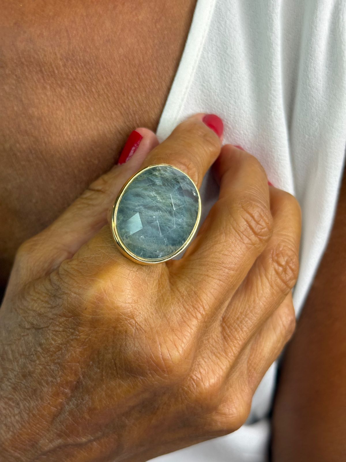 Sinta a força e a elegância de uma joia autêntica. Este anel Statement apresenta uma Água-Marinha natural de dimensões generosas, com uma lapidação oval multifacetada que revela a profundidade e o brilho cristalino característicos desta pedra preciosa.