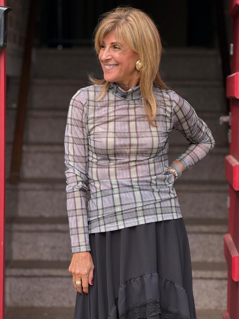 Confeccionada em tule elástico com leve transparência, a blusa possui uma estampa atemporal em xadrez, com tons neutros de cinza e toques de verde (ou oliva). O caimento é ajustado e valoriza a silhueta, enquanto a gola média e dupla oferece um acabamento elegante e um leve franzido no pescoço.