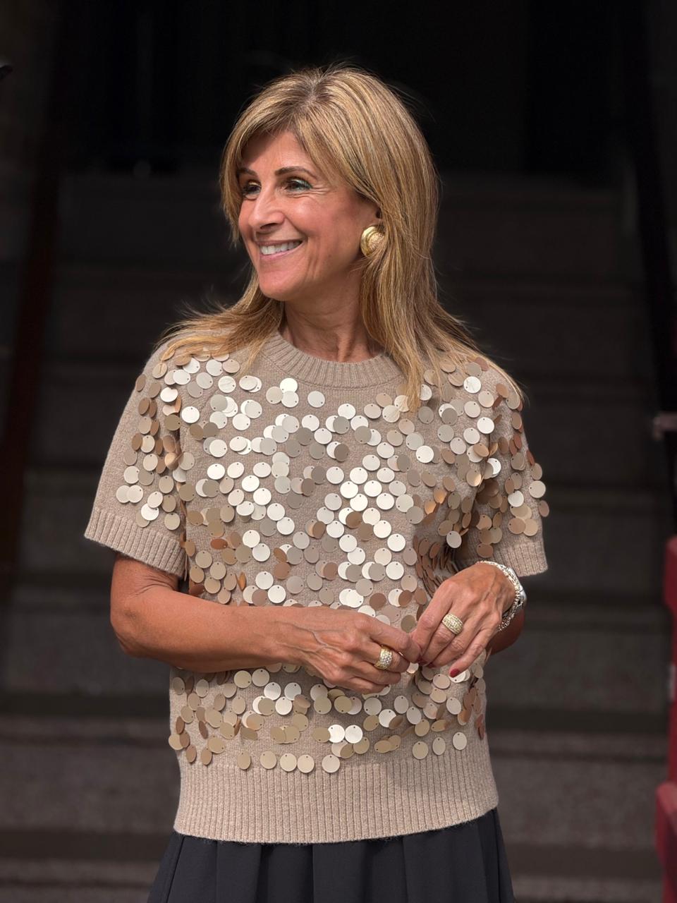 Confeccionada em uma luxuosa mistura de Lã e Cashmere, esta blusa de manga curta oferece o máximo de conforto térmico e um toque excepcionalmente macio. O design é elevado por uma aplicação deslumbrante de paetês redondos em tom de ouro claro ou champagne, que cobrem toda a parte frontal da peça, garantindo um visual statement e festivo.