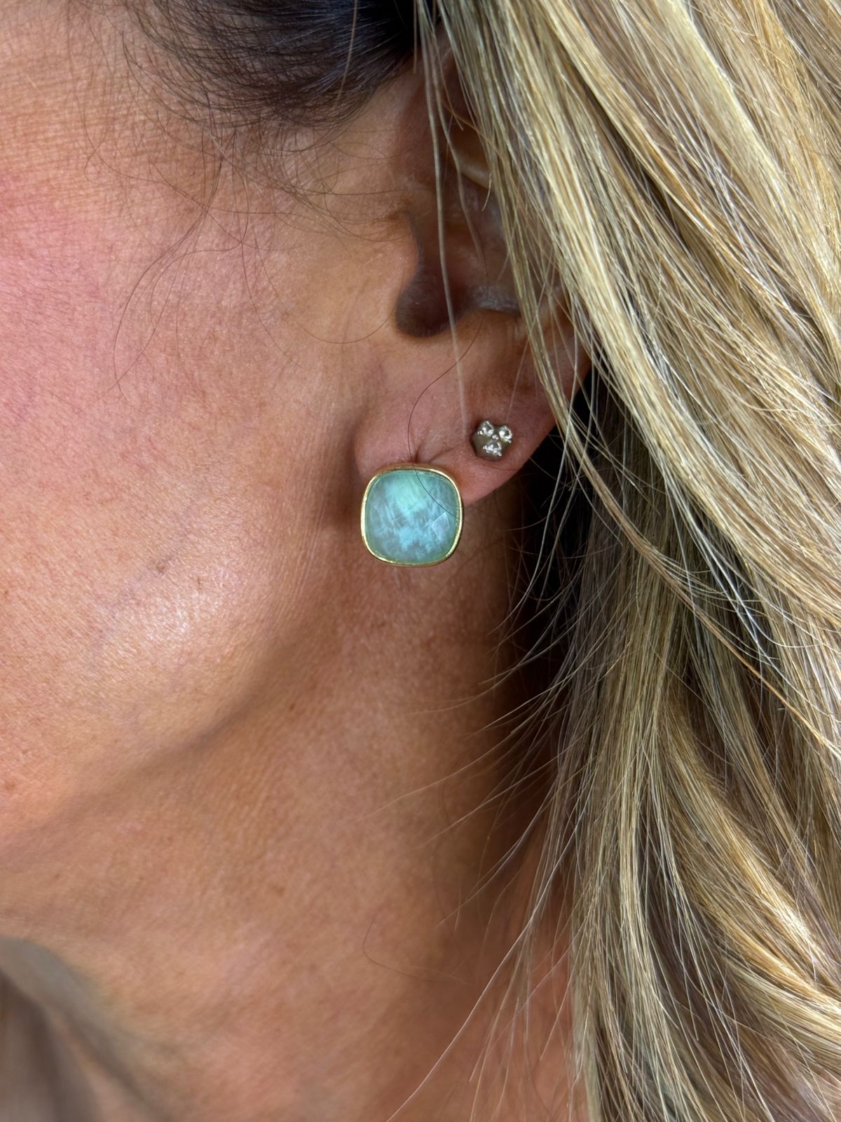 Eleve seu visual com a serenidade e a sofisticação da Amazonita natural. Este brinco apresenta uma pedra de formato quadrado suave (cushion), cuidadosamente lapidada para refletir a luz e destacar suas nuances únicas de verde-água e turquesa.