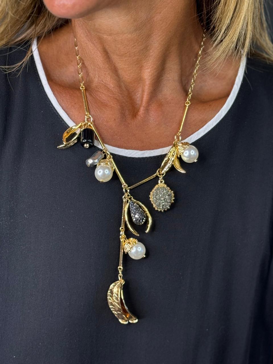 O Colar de Pendentes Variados é uma peça de design maximalista e sofisticado, ideal para quem busca um acessório que conte uma história. Com uma estrutura articulada em metal dourado, ele apresenta uma composição rica e assimétrica de elementos que remetem à natureza e ao luxo clássico.