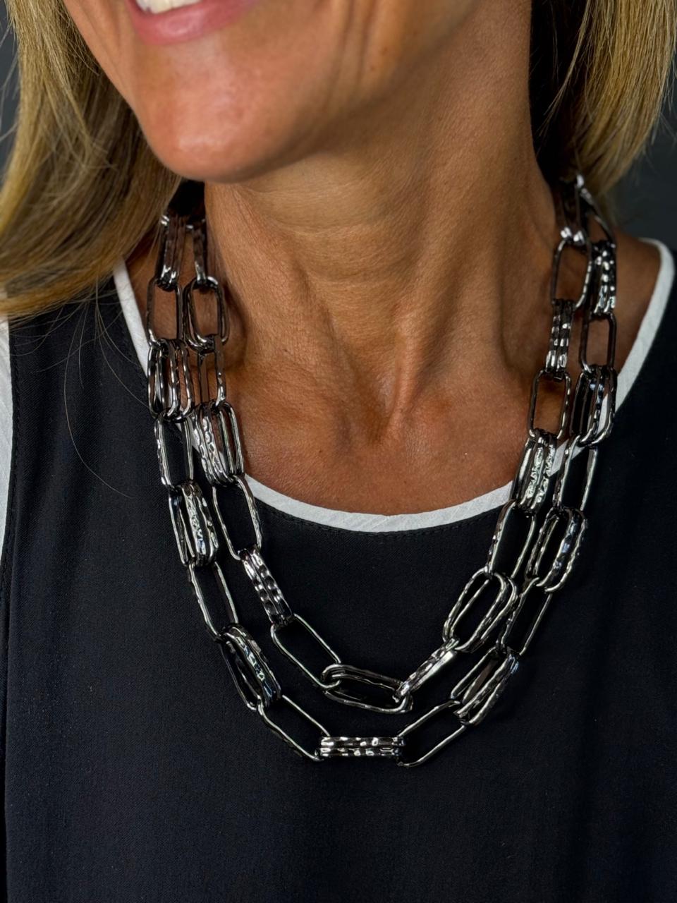 O Colar de Elos Duplos em banho negro é a escolha perfeita para quem deseja um acessório de impacto com um toque urbano e sofisticado. Seu design industrial chic, com correntes de elos alongados e textura trabalhada, traz uma estética "rocker" elegante que transforma qualquer produção básica em um look de passarela.